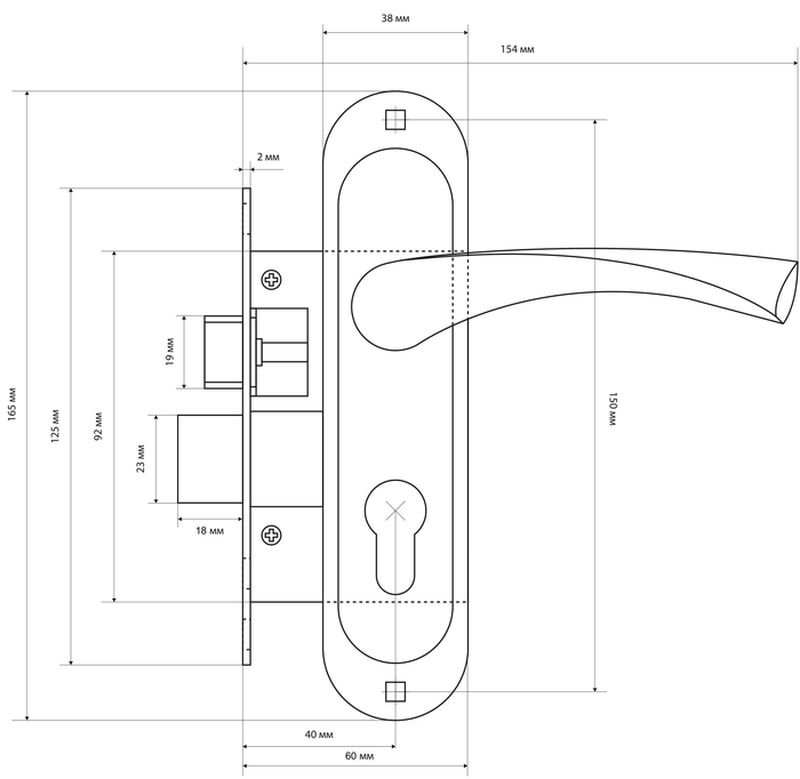 Замок врезной с ручками. Предназначен для установки в деревянные двери толщиной до 40мм, правого и левого открывания. Дверь может быть закрыта на защелку и открыта с помощью фалевой ручки при открытом засове замка.