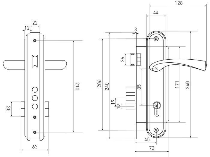 Замок врезной с ручками. Предназначен для установки в деревянные двери толщиной 35-38 мм, правого и левого открывания. Дверь может быть закрыта на защелку и открыта с помощью фалевой ручки при открытом засове замка.