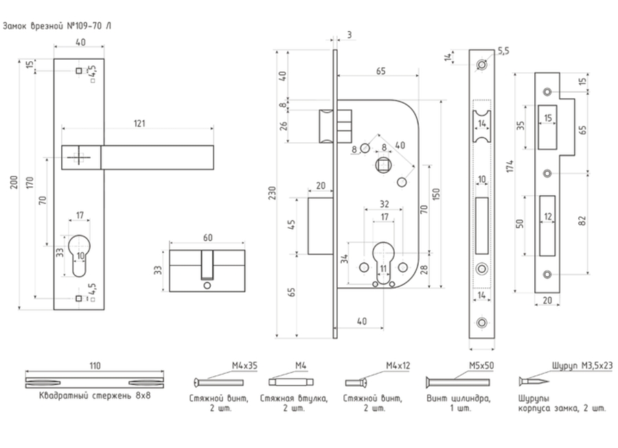 Комплект состоит из: ручек на планке (2 шт.), корпуса замка (1 шт.), цилиндрового механизма (1 шт), ключей (5 шт), ответной планки (1 шт.). Также в комплекте идёт крепеж для установки корпуса, ручек на планке и цилиндра.